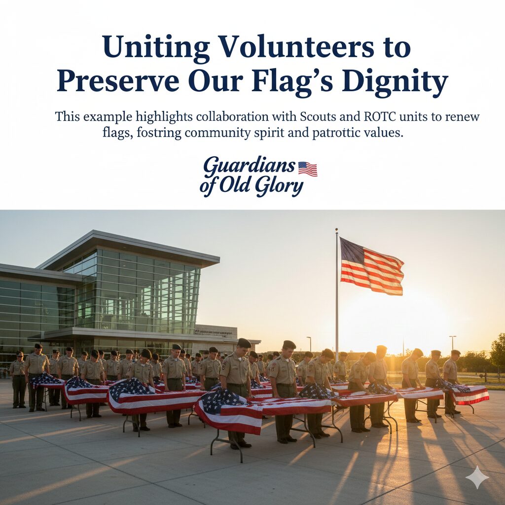 This example highlights collaboration with Scouts and ROTC units to renew flags, fostering community spirit and patriotic values.